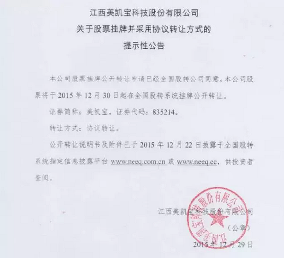 全國(guó)中小企業(yè)股權(quán)轉(zhuǎn)讓系統(tǒng)顯示,2015年10月28日美凱寶公開(kāi)披露掛牌材料,12月15日,美凱寶所遞交的“新三板”掛牌申請(qǐng)材料通過(guò)審批,成功登陸“新三板”,12月30日沒(méi)開(kāi)包正式掛牌上市!整個(gè)上市過(guò)程只用了2個(gè)月!